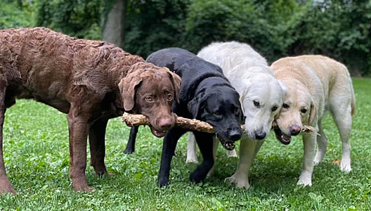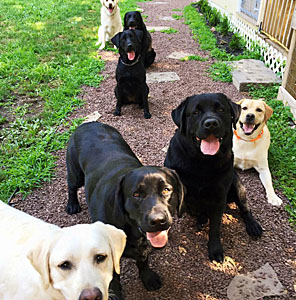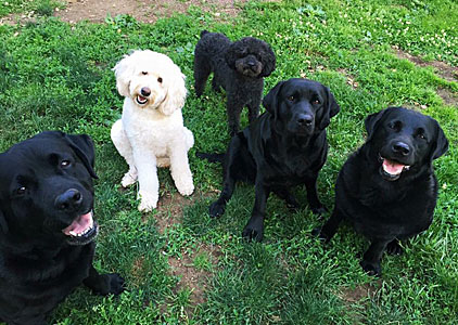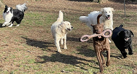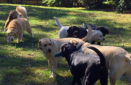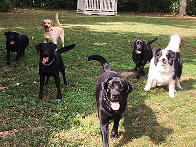 After many years of developing my little business, Walkin’ & Waggin’ grew to serve several wonderful families and their beautiful dogs. After moving to a larger house with a bigger, fenced-in yard, I was able to expand my services to include a doggie day camp. A social, exercised dog is a happy dog! When integrating dogs into my program, I became focused on temperament assessments and camp trials to make sure that everyone was going to get along. The campers range from young to old and big and small, but every dog must be respectful and gentle when playing and socializing. My criteria for enrollment are very strict, as not every dog is well-suited to be in my Walkin’ Waggin’ camp program. Before being accepted, every dog has to meet my high standard. Most dogs join my program at a young age, where I am in a position to provide them and their owners with my own steady leadership and with my dogs and the other dogs who have been in my program for a significant period of time serving as their dog role-models. Over time, Camp Waggin’ has become a harmonious and beautiful pack.